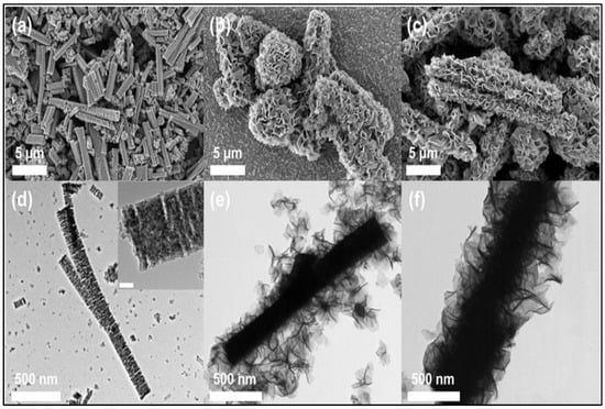 SEM images of (a) ZnO nanowires and (b,c) TiO2-NS-ZNW and TEM images of (d) ZnO nanowires and (e,f) TiO2-NS-ZNW. The images have been reproduced with permission [97].