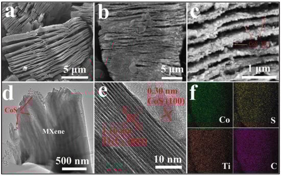 SEM images of (a) MXene and (b,c) MXene-CoS, TEM images of (d,e) MXene-CoS, and (f) an elemental mapping of MXene-CoS. The images have been reproduced with permission [111].
