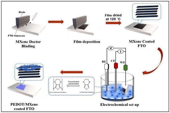 Another study focused on the use of Poly (3,4-ethylene dioxythiophene) (PEDOT)-decorated MXene (PEDOT-MXene) in DSSCs. Figure 6 shows a schematic representation of the PEDOT-MXene. The PEDOT-MXene-based DSSCs showed high electrochemical activity and mass transport ability, with PCE of 7.12%. Moreover, the prepared PEDOT-MXene-based DSSCs were stable for up to 15 days and an increase in PCE of around 40% was observed, which suggests that PEDOT-MXene-based DSSCs having the potential ability to replace Pt-based DSSCs [112]. Wen et al. synthesized a MXene-reduced graphene oxide (rGO)-polyethylene oxide/poly(vinylidene fluoride-co-hexafluoropropylene) (MXene-rGO-P)-based composite for use as a printable electrolyte. The data suggested that rGO and polymer incorporation within the MXene improves PCE. The maximum PCE observed was 8.255% [113]. Ahmad et al. synthesized MXene to replace the Pt and transparent conducting oxide (TCO) layer used in DSSCs. The data suggested that TCO- and Pt-free MXene were effective when used in DSSCs, as shown by 8.68% PCE. Moreover, PCE mainly depends on the thickness of MXene. PCE increased with the increasing thickness of MXene (up to 8 µm thickness) [114]. The literature suggests that MXene can potentially be applied to the development of solar cells, especially DSSCs with high PCE, thus replacing TCO and Pt within DSSCs. Moreover, incorporating other 2D-NLs, polymers, and nanoparticles within the MXene significantly improved PCE due to enhanced surface area, conductivity, adsorption of dye/loading of dye, and permeability. Moreover, the thickness of the MXene layer is an important factor that directly affects the PCE of DSSCs.