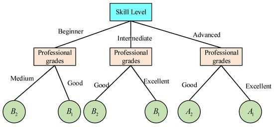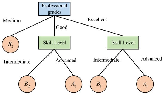 According to the MRSM-based decision tree generation algorithm, provided above, we first set the scale function, = 0.6, and the threshold, = 0.8. The process of constructing a decision tree using this algorithm is as follows: (1) Calculate the approximate accuracy of each conditional attribute relative to the decision attribute with respect to the scale function, f(s), according to Equation (1) and obtain = 0.74, = 0.15, = 0.32, = 0.15, and = 0.32. (2) According to Step 2 of the algorithm, the attribute (i.e., professional achievement) is marked as the root node . (3) As = 0. 74 > 0.6, proceed to Step 4 of the algorithm. (4) From the attribute e, there are 3 possible values (1, 2, and 3), and it is known that the formed tree has 3 different branches, where, in the case of = 1, the value of the suppression factor is obtained as 1 > A. Therefore, the attribute e is identified as a leaf. In the 2 cases of = 2 and = 3, the value of the suppression factor obtained does not satisfy ≥ A; then, the current subset is taken; return to Step 2 for the calculation. (5) Again, the approximate accuracy value is calculated according to Equation (1), and it is concluded that = 1 has the largest value; therefore, the node with the selected attribute (i.e., skill level) is the tree. Continue until a decision tree with a complexity of 8, a depth of 3, and 5 leaves is finally obtained (Figure 1).