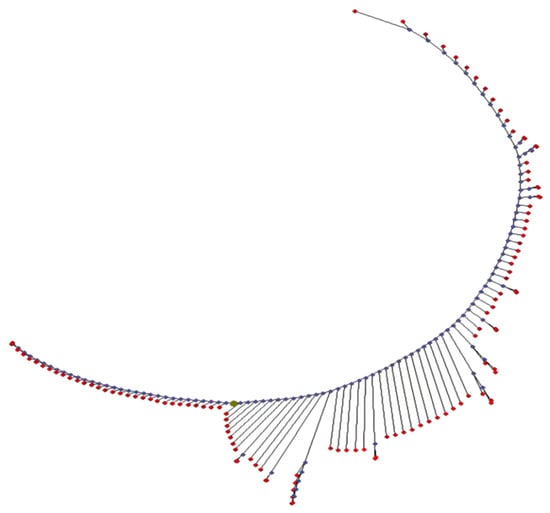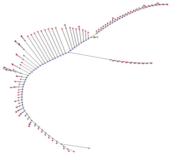 In Figure 3, the left part of the generated radiation tree has the worst fitting distribution of the graduates’ graduation direction (i.e., the most scattered distribution of the graduation direction of this type for the colleges and universities); the bottom “bulb” part in Figure 3 indicates the group of colleges and universities, and the graduation direction distribution of this part of the colleges and universities is disordered; thus, it is difficult to distinguish the superiority and inferiority; however, there are two types of colleges and universities with a similar distribution of graduation destinations. In Figure 4, the top-right branch of colleges and universities has a better distribution of employment and graduation destination; the top-right part of the colleges and universities has the best distribution of employment provinces (i.e., the most concentrated distribution of employment types in this type of colleges and universities). From the information on the graduates, the distribution of the employment geographical types of graduates from 120 colleges and universities was counted. Through the analysis, the most employed geographic areas of the graduates from most institutions were provincial capitals, followed by prefecture-level cities. The overall clustering results of the employment geographic types of the graduates from each higher education institution are shown in Figure 4, indicating that these colleges and universities have similar employment geographic types, and the employment geographic distribution of these colleges and universities is poorly fitted (i.e., the employment types of these colleges and universities are scattered). The “bulb”-shaped part on the top left indicates the group of colleges and universities, and the distribution of the employment geographic types of these colleges and universities is disorganized; thus, it is difficult to distinguish the advantages and disadvantages. The geographical distribution of the employment of the graduates from higher education institutions in the top-right branch had the worst fit. In Figure 4, the geographical distribution of the employment in the lower part of the “light bulb” shape is better. In Figure 4, the geographical distribution of the employment in the bottom-right part of the colleges and universities had the best fit, which means that the distribution of the employment types in this type of colleges and universities is the most concentrated.