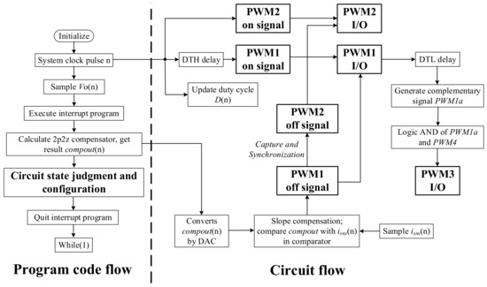 The right part is the circuit flow in MCU. The clock pulse also triggers the PWM2 rising edge and updates the duty cycle; PWM1 goes high after the DTH delay. When quitting the interrupt program, the circuit executes slope compensation and PWM comparison, finally generating the turn-off signal of PWM1. The falling edge of PWM2 is synchronized with PWM1, and outputs to PWM2 input/output (I/O) port. Then, PWM1 generates a complementary signal PWM1a after DTL delay. PWM4 is obtained by voltage–second balance, passes through AND gate with PWM1a, and outputs to the PWM2 I/O port.