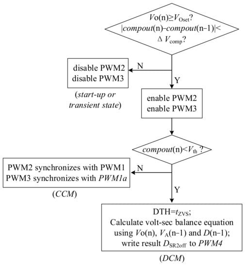 The program flow of circuit state judgement and configuration is shown in Figure 6. If the output voltage is lower than the nominal value (VOset), or the variation of compout signal over a threshold (ΔVcomp), the circuit is considered to operate in a transient state; otherwise, it operates in a steady state. In the transient state, PWM2 and PWM3 are disabled. Thus, SR switches are turned off. If the circuit works in a steady state, further judgement is made by comparing the compout signal with the other threshold (Vth). The circuit works in CCM if compout > Vth. PWM2 synchronizes with PWM1 and PWM3 synchronizes with PWM1a. On the other, the circuit works in DCM if compout < Vth.