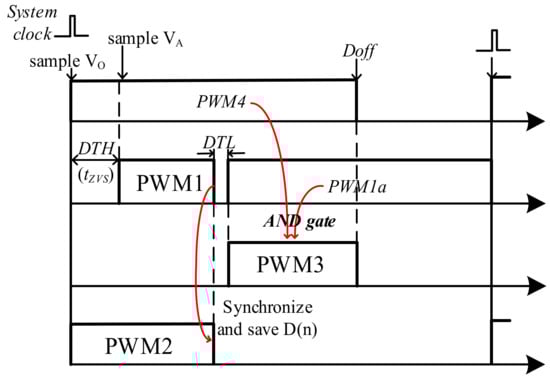 Then, the program assigns DSR2off(n) to the duty cycle register of PWM4. Finally, the hardware circuit performs the AND logic of PWM1a and PWM4, which generates the PWM3 signal. The timing sequence and relationship of PWM signals are drawn in Figure 7.