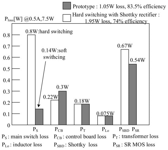 Estimated power loss comparison between the prototype and the traditional forward converter at 0.5 A load and 28 V input.
