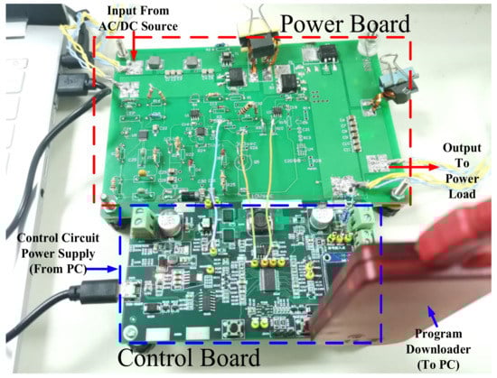 The prototype is fabricated based on the above parameters, and its picture is shown in Figure 9. The circuit board consists of a power board and a control board. The USB (universal serial bus) port of the PC powers the control board. The program downloader downloads the program to MCU from the PC. The control board samples the input signals from the power board, processes input signals by MCU, and then outputs gate-drive signals to the MOSFET drivers on the power board. The connection wire length between the control board and the power board has been minimized. It was found that the connection wire delay is less than 10 ns, which can be ignored.