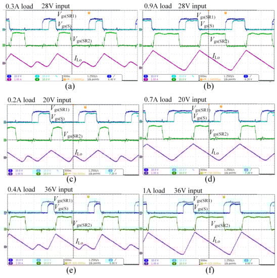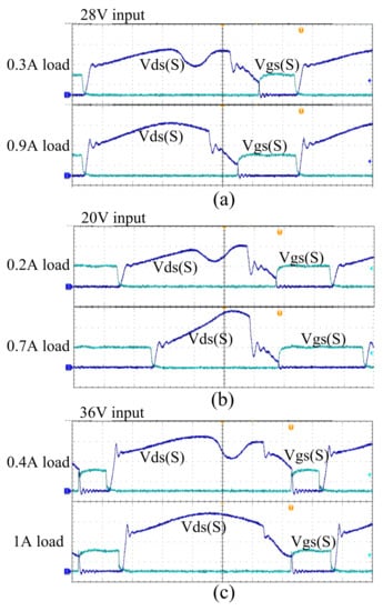 Figure 11 shows the drain–source voltage Vds(S) and gate-drive voltage Vgs(S) of the primary switch S under different input voltages and loads in DCM. After S turns off, Vds(S) rises to its peak. The maximum Vds(S) is 60 V at 36 V input, which is consistent with the calculated value. After SR1 turns on, Vds(S) decreases in resonance, and S turns on when Vds(S) drops to the minimum value. (1) At 28 V input, which is shown in Figure 10a, Vds(S) resonances from 44 V to 10 V at 0.3 A load; it resonances from 46 V to 8 V at 0.9 A load. The minimum voltage is basically consistent with the calculated value (5 V). (2) At 20 V input, which is shown in Figure 10b, Vds(S) resonances from 40 V to 8 V at 0.2 A load; from 52 V to 6 V at 0.7 A load. (3) At 36 V input, which is shown in Figure 10c, Vds(S) resonances from 46 V to 20 V at 0.4 A load; it resonances from 46 V to 14 V at 1 A load. Thus, S turns on under quasi-ZVS is realized in DCM.