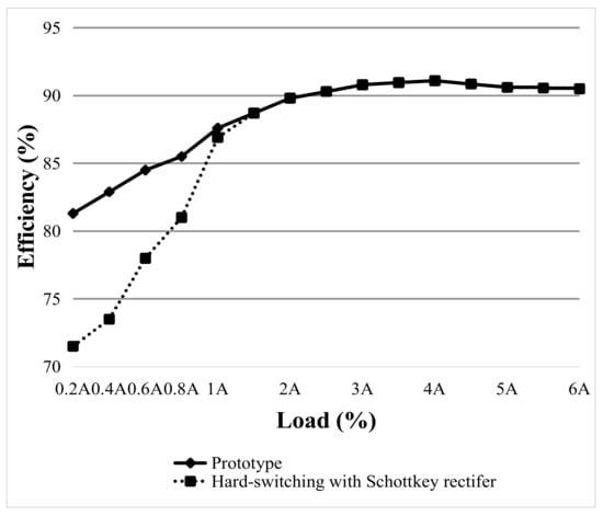 The efficiency curves at 28 V input are shown in Figure 14. The prototype is compared with the traditional converter, which has hard-switching and Schottky rectification. At 0% to 20% load (0 A to 1.4 A), the efficiency is above 81%, which is 5% to 10% higher than the traditional converter. Especially, the efficiency is 84% at 0.5 A, 9.5% higher than the traditional converter. The result is consistent with the estimated efficiency in Figure 8. It is noteworthy that the control board loss is considered in the efficiency test. Losses of the control board and the power board at light load are shown in Table 3.