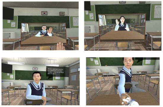 Before proceeding with the experiment, frontal photographs of the participants’ faces were taken after obtaining consent from all of them, regardless of their group. Researchers took pictures of the participants’ faces using a Canon G7 X Mark II digital camera in the same space, and it was announced that the photographs were for the purpose of making avatar faces. The facial pictures were used to create avatars for the participants of Group 1 using Character Creator 3 (Available online: https://www.reallusion.com/character-creator/ (accessed on 27 December 2022)), a 3D character creation tool, and the Headshot plugin, an AI-based 3D head creation tool (Available online: https://www.reallusion.com/character-creator/headshot/ (accessed on 27 December 2022)). The avatars for the participants in Group 2 were created in a similar manner based on facial photographs of people who did not participate in this experiment. All avatars had a same-gender body type and wore a school uniform. The created avatars were imported to the VR stimulus.