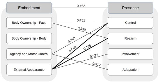 We conducted a correlation analysis between the participants’ sense of embodiment and presence to identify any meaningful relationships that could help explain how the two concepts are related; for this purpose, we utilized Spearman’s Rank Correlation Analysis. The identified moderate and significant correlations between embodiment and presence and their subscales are illustrated in Figure 6. The results indicate a moderate correlation (0.462) between embodiment and presence. The highest level of correlation (0.766) was found between the External Appearance subscale of embodiment and the Realism subscale of presence, thus indicating the importance of avatars’ external appearance in promoting a realistic VR experience. In addition, External Appearance had high (0.502) and moderate (0.377) correlations with the Control and Immersion subscales of presence, respectively. The correlations between the Body Ownership—Face subscale of embodiment and the Control and Realism subscales of presence were 0.451 and 0.350, respectively. Moreover, the Agency and Motor Control subscale of embodiment showed moderate correlations with the Control (0.380) and Adaptation (0.317) subscales of presence. In sum, we observed significant correlations between the subscales of embodiment and presence, with External Appearance being a major factor in the embodiment–presence relationship.