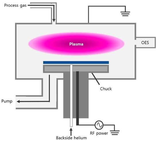Variations in the process gas flow rate are another factor that can affect the etch profile. A dry etching process using plasma is required for HAR etch. Here, in addition to the F-based gas, a mixture of various gases is used to improve the etch profile. When an O2-containing mixed gas is used, O radicals combine with Si to form SiOxFy on the sidewall to improve the etch profile [9], implying that the etch profile is affected by the process’s gas flow rate change. The reaction of the gas injected during the process can be checked through the plasma, and the relative amounts of ions and radicals inside the chamber can be estimated by analyzing the reaction that occurs in the plasma through the sensor. As a result, most chambers now have sensors attached to analyze plasma. The OES is a non-invasive plasma monitoring sensor that does not interfere with the process and is used to monitor plasma due to its ability to analyze plasma generated during the process.