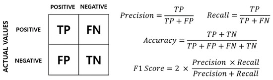 Through the FC model, we sought to identify minute alterations that might take place in plasma-based semiconductor machinery. The FC model is assessed using a confusion matrix, which expresses the classification outcomes as follows. The confusion matrix is divided into the following four categories: True Positive, False Positive, False Negative, and True Negative. Using these four categories, the model can be assessed in various ways. Figure 4 illustrates the general model evaluation methods, including Precision, Recall, Accuracy, and F1 score [22].