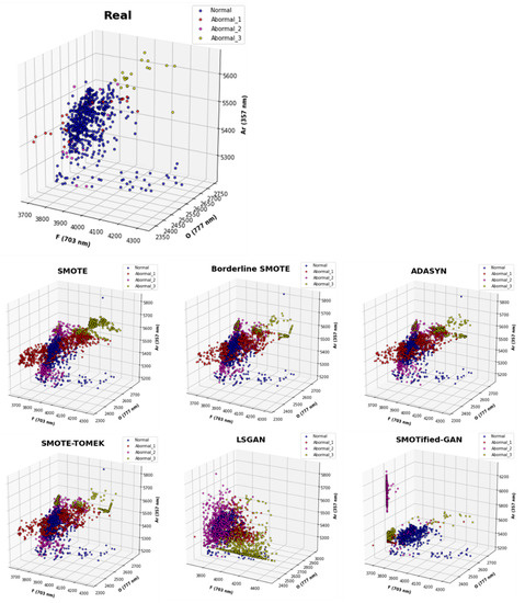 Attempts to monitor processes using OES have been made in the past. Studies have been conducted to detect internal gas flow by analyzing OES data [10], and attempts have been made to observe faults that occur during the process using an FDC model based on the data [11]. However, these studies all had one thing in common: the problem caused by data imbalance. There is a limit to the amount of data that can be obtained due to a problem of available resources, such as budget, which may occur in a research environment, resulting in data imbalance. Previous studies successfully identified the occurrence of faults by securing an appropriate amount of normal class data, but the classification of fault causes was difficult because abnormal class data sufficient to classify various types and causes of faults were not secured. Various oversampling methods were compared and evaluated in this study to improve the data imbalance problem, and we propose an oversampling model suitable for plasma spectroscopic sensor data that can alleviate the overfitting problem that may occur due to oversampling and undersampling.