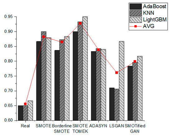 Figure 6 and Figure 7 display the visualization of the data following oversampling. Data preprocessing results were examined for model comparison, and the model and data were assessed based on recall values. Recall values for every fault class in the model were examined. A fault class-sensitive model can be developed using recall, an indicator that measures how many of the actual values for the corresponding classes have been correctly predicted. The results of our training for the three classification models of AdaBoost, KNN, and LightGBM using seven datasets created with real data and six sampling models are shown in Figure 6 and Figure 7.