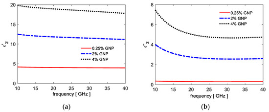 The real and imaginary parts, and , of the permittivity are represented in Figure 2a,b, respectively, for composites filled with a GNP weight concentration ranging between 0.25% and 4%.