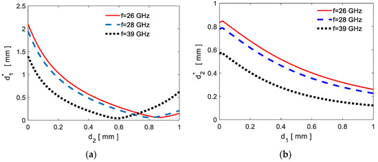 Optimal thickness as a function of (a) and optimal thickness as a function of (b), computed at the target frequencies of 26 GHz, 28 GHz and 39 GHz.