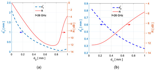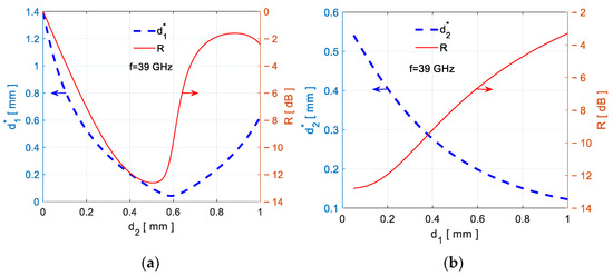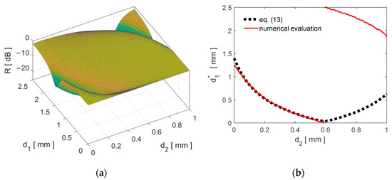 3D−map reporting the computed R values for all the (d1,d2) combinations in the selected d1 and d2 intervals at the target frequency of 39 GHz (a) and optimal thickness computed numerically (red line) or by Equation (13) (black dotted line) (b).