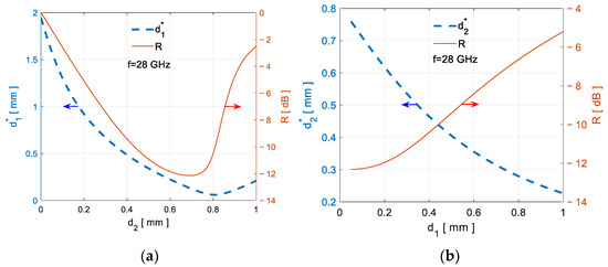 In order to clarify and validate the proposed analytical approach, the reflection coefficient R is computed numerically by means of Equation (1) considering all the possible () combinations at the target frequencies. As an example, a 3D-map reporting the computed R values for ranging between 0 and 2.5 mm and between 0 and 1 mm at a frequency of 39 GHz is shown in Figure 4a. Successively, the value giving rise to the minimum reflection coefficient for each selected value is computed numerically. The obtained curve (red line) is reported in Figure 4b in which it also appears the curve computed by means of Equation (23) (black dotted line). It is worth noting that the curves are almost overlapping for values lower than 0.6 mm and the relative percent difference between them is always lower than 5% in the decreasing part of the ( curve.