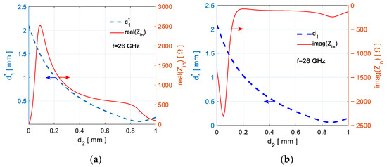 Real (a) and imaginary (b) parts of input impedance as function of (d2) at a frequency of 26 GHz.