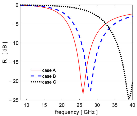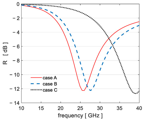 The obtained frequency spectra of the reflection coefficient for the cases A, B, and C in Table 3 are represented in Figure 10 for normal incidence.