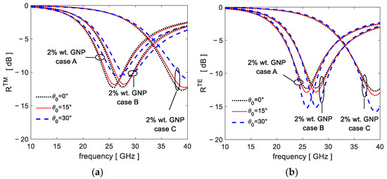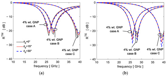 Finally, the reflection coefficients RTM and RTE are computed for an incidence angle ranging between 0° and 30° and assuming the layer thicknesses reported in Table 2 and Table 3 for the composite filled with 2% and 4% of GNPs, respectively. The obtained results are shown in Figure 11 and Figure 12.