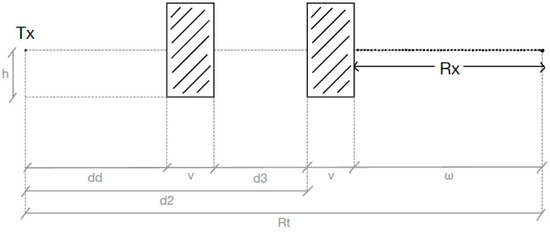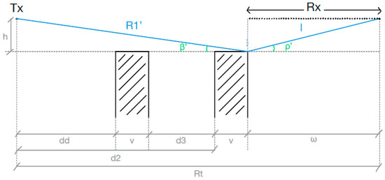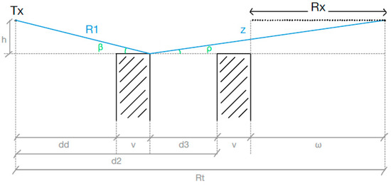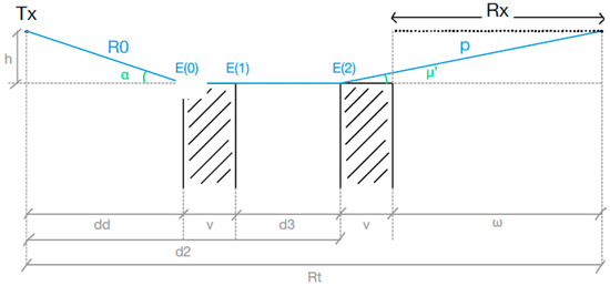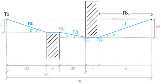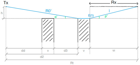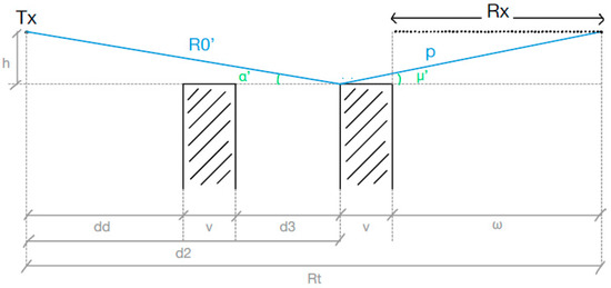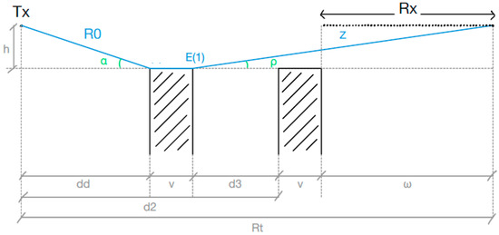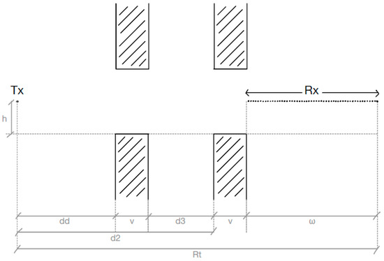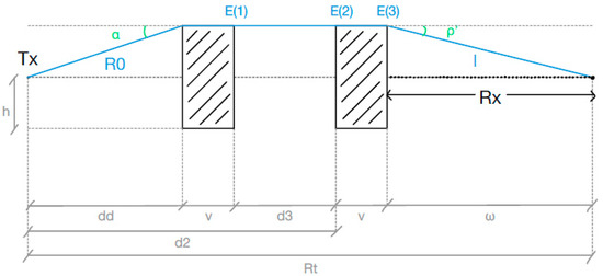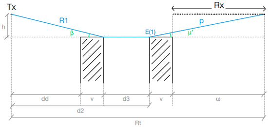 Figure 1 shows the scheme of the first scenario analyzed, which in this case represents an LOS situation in a street canyon comprising two perfectly conducting rectangular blocks on each side. The figure shows the transmitter point (Tx) and the line (ω) along which the different receiver points (Rx) are located. In addition, the different distance parameters that are taken into account when developing the GO/UTD formulations are also shown. In the following subsections, the expressions of the different contributions reaching the receiver are obtained.