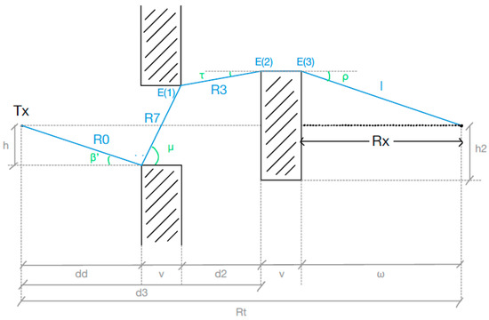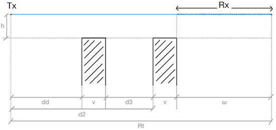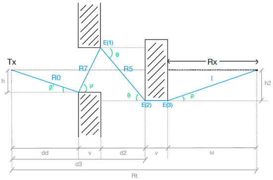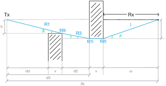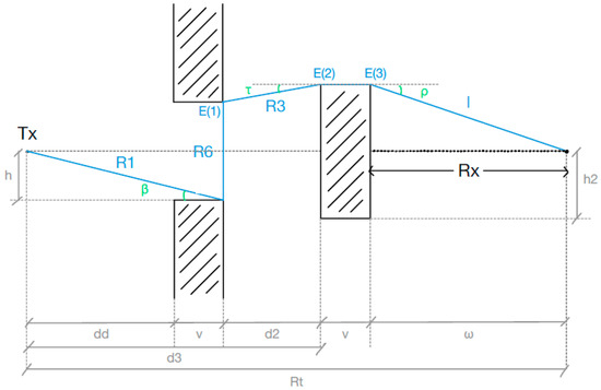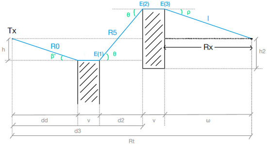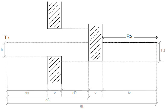 Finally, Figure 17 shows the scheme of the third scenario analyzed, where, in this case, perfectly conducting rectangular blocks located on both sides of the path between Tx and Rx and in between (NLOS situation) are combined. In the following subsections, the GO/UTD expressions of the different contributions reaching the receiver are developed.