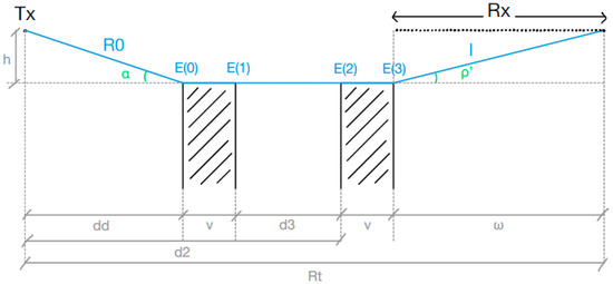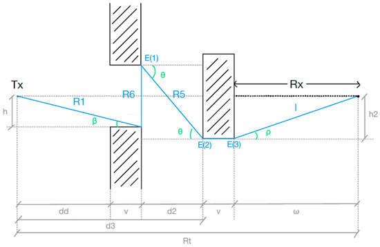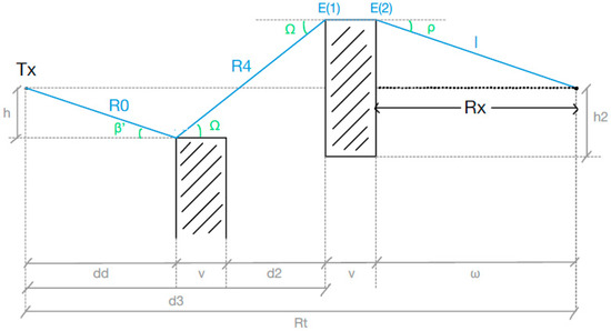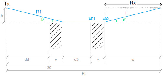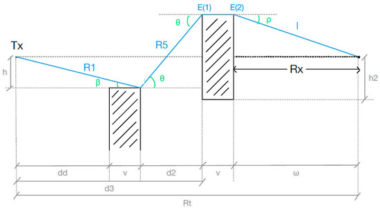 Figure 15 shows the scheme of the second scenario analyzed, which in this case represents an NLOS situation in a distribution comprising two perfectly conducting rectangular blocks located right in the middle of the path between Tx and Rx. In the following subsections, the GO/UTD expressions of the different contributions reaching the receiver are obtained.