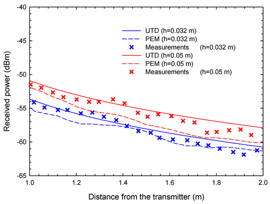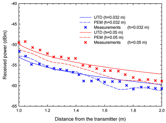 In this case, the parameters dd = 0.6 m, v = 0.03 m, and d2 = 0.8 m (when applicable) are considered. Figure 28 and Figure 29 show the theoretical received power results (for one and two obstacles, respectively, and two values of h: 0.032 m and 0.05 m), calculated with the developed GO/UTD formulations, as a function of the distance from the transmitter. In addition, to compare the goodness of these results, the measurements presented in [8] for the same scenarios and parameters are included in the figure. Additionally, for comparison purposes, the curves obtained with the PEM-RCNBC method are also shown in the plots.