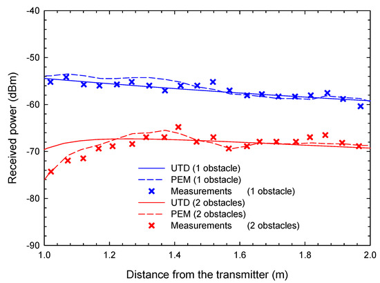 In this first NLOS case, the parameters dd = 0.42 m, v = 0.03 m, d2 = 0.92 m (when applicable), and h = 0.0375 m are considered. Thus, Figure 30 shows the theoretical results of received power for one and two obstacles achieved with the GO/UTD formulations obtained as a function of the distance from the transmitter. In this case, to validate these results, the measurements presented in [7] for the same scenarios and parameters are included in the figure. Moreover, the values obtained with the PEM-RCNBC method are also included in the figure.
