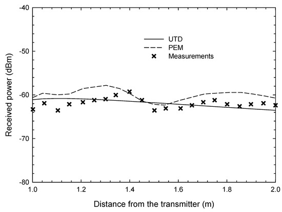 In the second NLOS scenario analyzed, the parameters dd = 0.6 m, d3 = 0.8 m, v = 0.03 m, h = 0.032 m, and h2 = 0.0375 m are considered. Thus, Figure 31 shows the theoretical received power results obtained with the developed GO/UTD formulations as a function of the distance from the transmitter. Additionally, in this case, in order to validate the results, the measurements presented in [7] for the same scenario and parameters are shown in the figure. On the other hand, the curve obtained with the PEM-RCNBC method has been included in the plot.