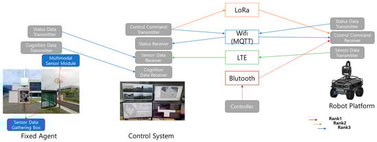 Figure 1 shows the four types of communication methods (LoRa, Wi-Fi, Bluetooth, and LTE) that play a role in the consideration of each characteristic for the mobile agents. The proposed system uses Bluetooth communication (first priority) for direct user control, LoRa communication (second priority) for emergencies, Wi-Fi communication (third priority) for normal performance, and LTE communication for sensor data transmission. The flowchart of the control data for the mobile agent is shown in Figure 2. The fixed agent sends sensor and cognitive data through one-way communication using the Internet.