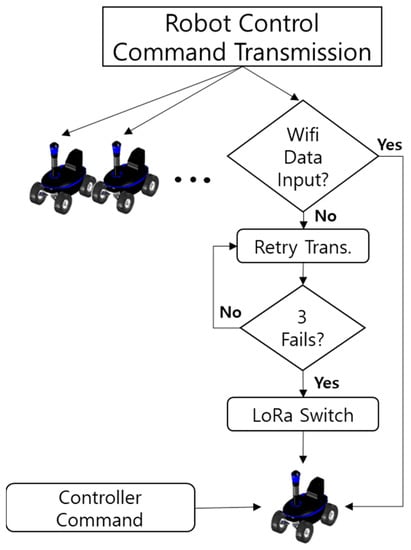 Therefore, the mobile agents execute control commands according to the priority of each communication method. First, Bluetooth is employed for short-distance control, because the operation of multiple robots requires reliable communication. Second, normal control and status communication are performed to cover a large outdoor area using multiple Wi-Fi modules. Finally, the mobile agent is configured to transmit sensor data using LTE with a wide bandwidth. Details of the communication methods used are as follows: