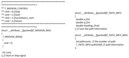 Table 1 lists the details of each communication module constituting the system used with the multiple communication method. For LoRa, two models for transmission and reception are used, both of which employ frequencies in the range of 917–923 MHz and have a bandwidth of 125 kHz. Although this method has a narrow bandwidth, it is suitable for communicating control commands in emergencies because a coverage of ≥10 km is possible, even in an urban environment. The communication method is implemented following the transmission protocol and using send/receive messages; the details are presented in Table 2 and Figure 3.