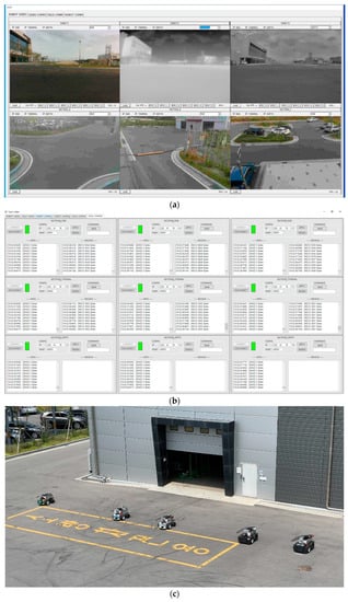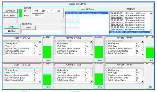 With the control system built using the agent core-based framework, it was possible to communicate with an agent using Linux (communication server) and Windows (UI and status check). Therefore, by integrating the data of the agents, an integrated control system was built on two locations; this allowed the user to check the agent status, mission information, and abnormal situation information or to assign tasks to multiple agents (Figure 13).
