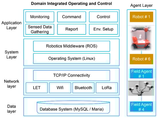 The architecture of operating an integrated control system for guarding an outdoor environment using multiple robots is shown in Figure 7. It comprises four layers: the network layer that uses the four types of communication methods mentioned in Section 2; the system layer that includes middleware for connecting with several agents; and the UI that enables monitoring, reporting, commands, and mobile agent control. Further, it comprises an application layer and a data layer for storing monitoring data. Therefore, the system is designed to perform various security missions. Moreover, monitoring and positioning interfaces are added for access to the status information of the mobile agents (e.g., battery level, number of agents available, working hours, and agent failure).