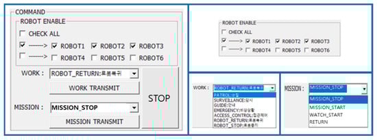 To perform the different security missions, allocating a path for each mobile agent mission is necessary. Therefore, the control system assigns missions (e.g., patrol, surveillance, and guidance), receives sensor data and status information from fixed and mobile agents, confirms with the administrator, and configures the interface to perform the task, as shown in Figure 8. In the COMMAND modal window, the function to give control commands to the robot is included. In the ROBOT ENABLE modal window, the user can select the mobile agent they want to control on the security site. In the WORK modal window, the user can send commands such as: patrol, monitoring, guidance, emergency, access control, return to all, and stop all tasks, to the mobile agent. Finally, in the MISSION modal window, the user can select mission stop, mission start, watch start, and return. Therefore, the control system has an interface that the user can utilize to comprehensively control the agent’s mission (e.g., surveillance, patrol, guidance, and return) and to select the numbers of agents and the mission of each agent. Further, the user can control the agents at any time while monitoring.