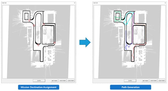 Moreover, the control system configures the Map UI by receiving the user’s input, such that the user can allocate the mission and route information to command the mobile agents to perform the mission. Further, it uses the coordinates on the map to perform the mission and transfers it to the global path-planning algorithm [8]; thereafter, it displays the individual routes received on the map, allowing the administrator to intuitively set the mission (Figure 9).