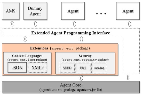 The proposed control system in the outdoor environment based on multiple fixed and mobile agents created a unique tag for message transmission between the sending and receiving agents. Each agent was connected to one agent core and transmitted a message by recognizing the tag, regardless of the IP and port number, as shown in Figure 12. When creating an agent, the ID was registered in the agent core, and when the sending agent transmitted the message, the agent core separated the message and transmitted it to the receiving agent.
