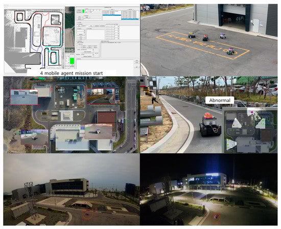 We proposed a system that can be used to control multiple agents (fixed and mobile agents) using multiple communication methods. Further, this system can also be used to provide security services. An efficient UI and control system for security services in large outdoor environments was developed, and the necessary factors were analyzed. The proposed system was applied to two sites (Pohang and Gwangju). The multimodal sensor dataset built using the proposed system is used openly [21] and the data are stored in the form of a probability map to learn and respond to abnormal situations [22]. This system is expected to be used not only for practical application of domestic robots and surveillance systems but also to impact related research areas. Further, different communication methods will have to be developed to suit various purposes.
