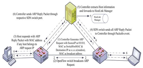 In [], Network Mapper (NMAP) utility-inspired researchers propose a host discovery approach that sends ARP-Request messages from the controller side to determine the host details as soon as an OpenFlow switch-to-controller connection is established. The authors used OFPT PACKET CONTROL messages to generate ARP-request messages to switch the port with a random destination IP and broadcast MAC. The OpenFlow switch broadcasts ARP-request messages. The connected live host with an IP address will respond to the switch with an ARP reply message during this process. The OpenFlow switch will forward ARP-reply messages to the controller to extract the necessary host information from the messages. The controller will now have complete network environment details, such as the host IP and MAC, switches and switch ports, and interconnectivity between them thanks to this host discovery module and LLDP. This method worked properly when an OpenFlow switch was connected to an operational controller. The approach did not perform well when the switch was started before the controller or when the switch was detached from the controller; as such, some changes were made to the status of the switch port. The same switch was connected to the controller again. The approach used the OFPT PORT STATUS message, and it worked with changes such as deletions, additions, and status changes in switch port status.