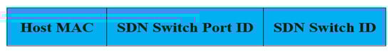 After extracting host information from an ARP reply packet, IDeA sends it to the HostLink Manager to create the necessary entry in the HostLink Table []. The HostLink Manager verifies the host identity from the HostLink Table and performs the following verification tasks. If there is no host information in the table, it adds host information. In [], a table was proposed to record the connected host MAC and IP details, similar to the HostLink Table. Host identity information is stored in the host MAC, SDN Switch Port ID, and SDN Switch ID. Figure 3 depicts the format of the HostLink Table.