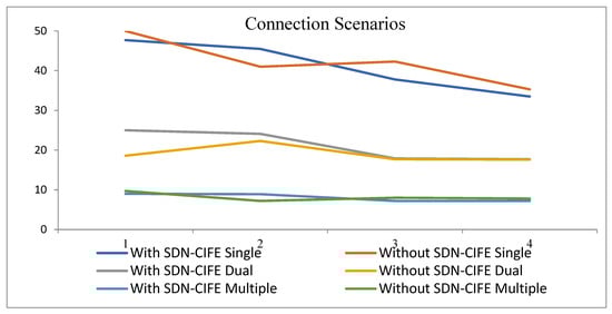 A system bandwidth delivery analysis was carried out using an H3S network scenario with single, dual, and multiple connections and a different number of hops. The test was conducted without and with the SDN-CIFE system. The results indicated that after implementing the proposed approach, the bandwidth delivery improved with three or more hops. The results given in Figure 7 and Table 4 were collected during testing.