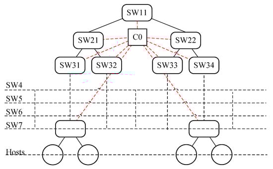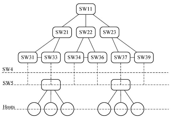 In Figure 8, Tree,5,3, all the leaf and root OFSwitches are connected to six other switches. Three interconnected OFSwitches are shown in layer 3 with the notation SW34–SW36; layer 5 and 4 are represented by SW5 and SW4, respectively. The hosts are linked to the OFSwitches at level five. Except for the leaf and root OFSwitches, each OFSwitch in Figure 9 Tree,7,2 is connected to two other switches. The two connected OFSwitches are shown in layer 3 in SW33-SW34, while levels 4–6 are represented by SW4, 4–5 by SW6, and layers 6–7 by SW7. Hosts communicate with OFSwitches on the seventh level. As can be seen in Figure 10, the three-tiered Tree,3,5 architecture features fully linked second-tier OFSwitches at every node. Five interconnected OFSwitches can be seen in the diagram at position SW21–SW25, while position SW3 represents the OFSwitches in the third layer. Hosts connect to the OFSwitches at the third-level.