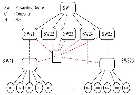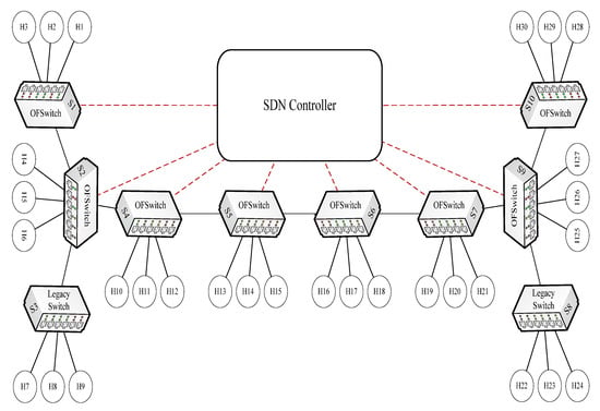At the absolute least, one OFSwitch is linked to each and every switch. Connected hosts and switches are represented by the numbers H1 through H30. Information on the hardware and software, SDN controllers, software library, network analyzer tools, and other resources used for SDN validation [] is summarized in Table 7. During testing, we simulated assaults using the Scapy software library.