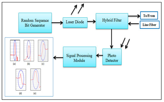 The Modern FPMT technique is communicated to the board communication and control module for control purposes and then to the main controller of the cabinet so we can show the analysis and parameters of the returned back signal (reflected test signal). The multiplexer module is used to multiplex the traffic signal coming from the EDFA side with the test signal coming from the FPMT side. The EDFA board sends the test signal using different wavelengths to avoid interference with the system and traffic [16]. The wavelength of the EDFA board in DWDM is C band; it runs from 1525 nm to 1565 nm and from 191 to 196 THz [49,50].
