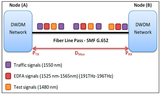 The test signal through fiber lines carries over SMF-G.652 [54,55]. The wavelength SMF G.652 with the best transmission performance is 1550 nm, with an attenuation value of around 0.22 dB/km [17,54,55].