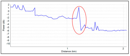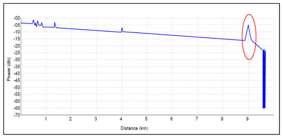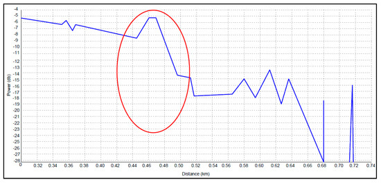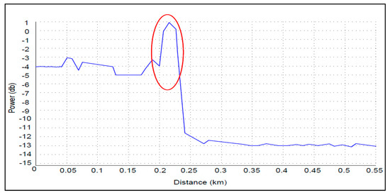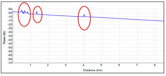 Event (3). A fiber end-face burning is produced in the actual implemented network at a distance of 0.45 km and applying an improved FPMT approach integrated with the EDFA board to detect defects. According to the practical data in Figure 9, the reflection peak is around 0.45 km, the reflection rate is around −8 dB, and there is a certain pattern form that represents the fiber end-face burning. The parameters and practical results detected at event 3 are shown in Table 7.