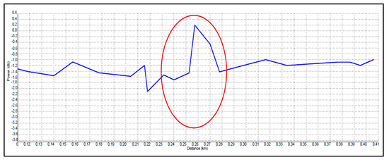 Event (2). A fiber end face contamination is produced in the actual implemented network at a distance of 0.2 km and an improved FPMT approach integrated with the EDFA board is applied to detecting defects. According to the practical data in Figure 8, the reflection peak is around 0.201 km, the reflection rate is around −4 dB and there is a certain pattern form that represents the fiber-to-end-face-contamination. The parameters and practical results detected at event 2 are shown in Table 6.