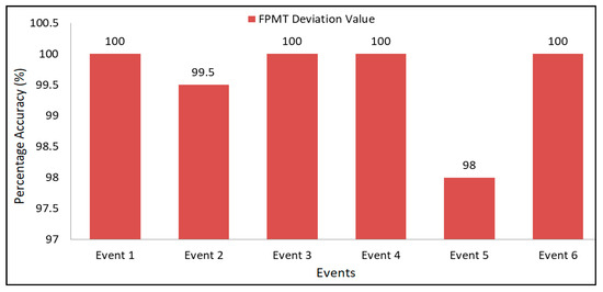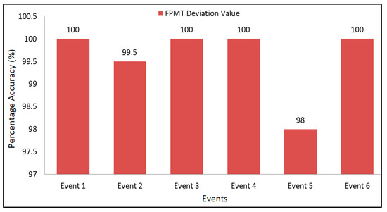 Utilizing the enhanced FPMT approach, the defects have been localized with 100% accuracy for events 1, 3, 4, and 6 and with great precision ranging from 99.5% to 98% for events 2 and 5, respectively. Figure 16 shows the measurement reliability for each event, with a measurement accuracy for defect location of up to ~99.9%
